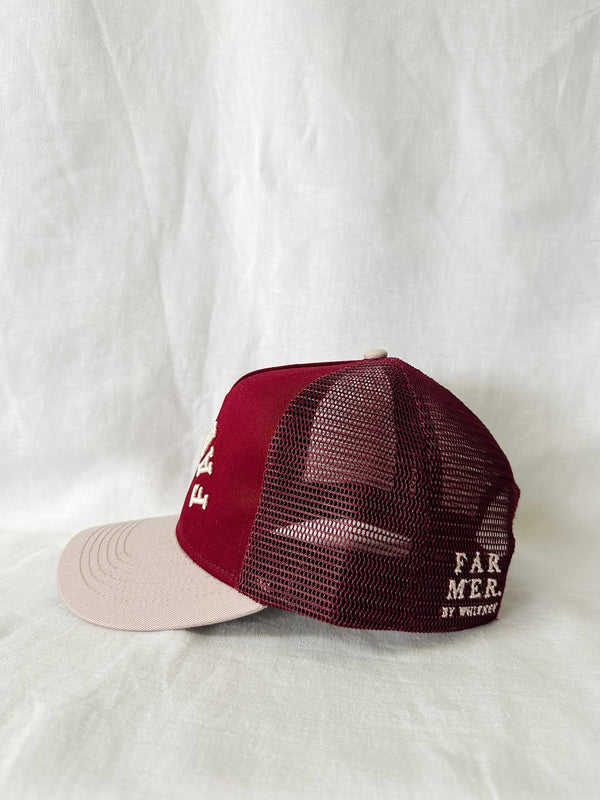'FAR MER' embroidery on maroon cotton with adjustable snap back