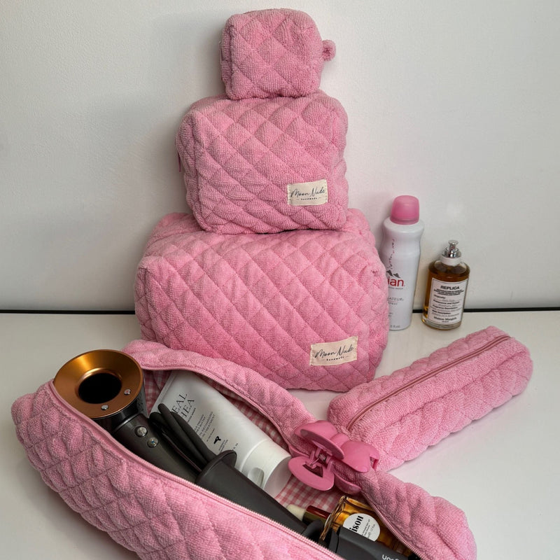 The quilted pink terry exterior is thick and luxurious, complemented by the matching pink gingham interior.
