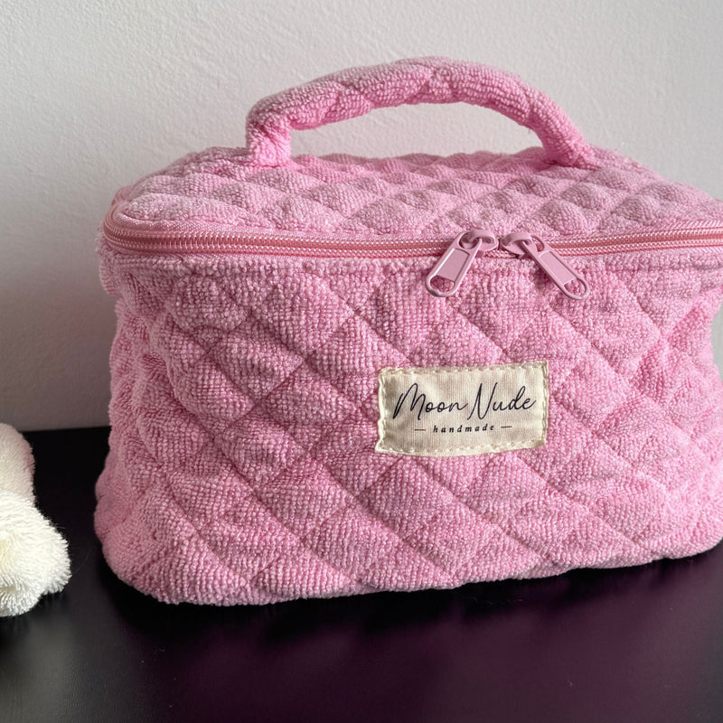 The quilted pink terry exterior is thick and luxurious, complemented by the matching pink gingham interior.