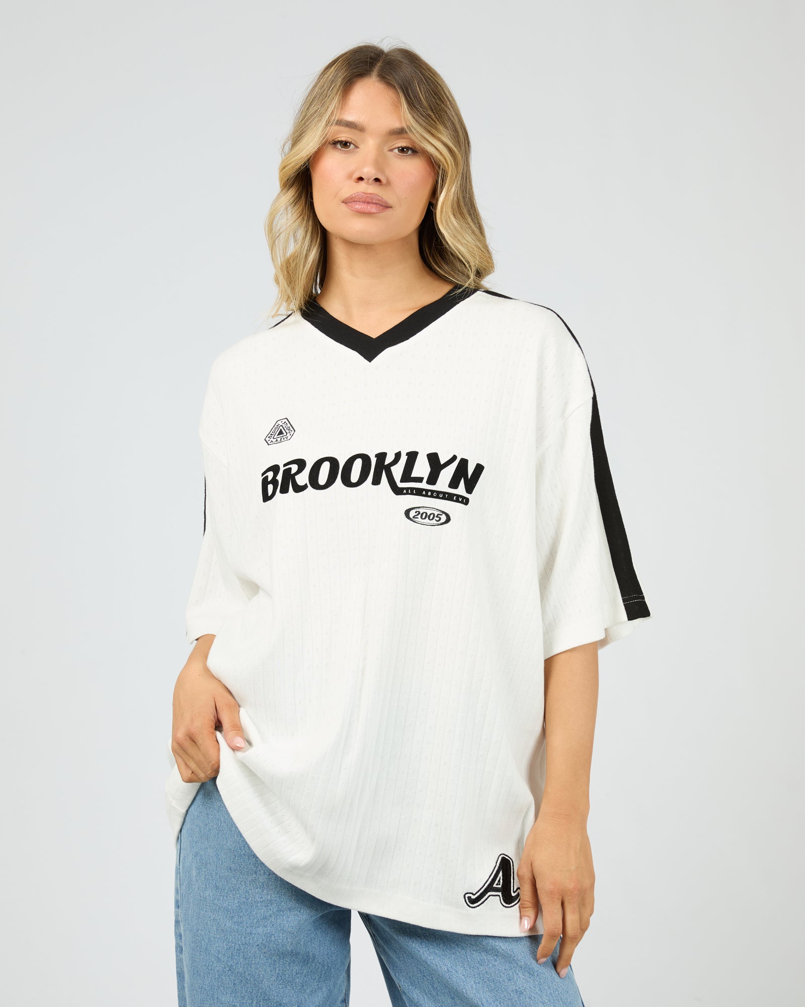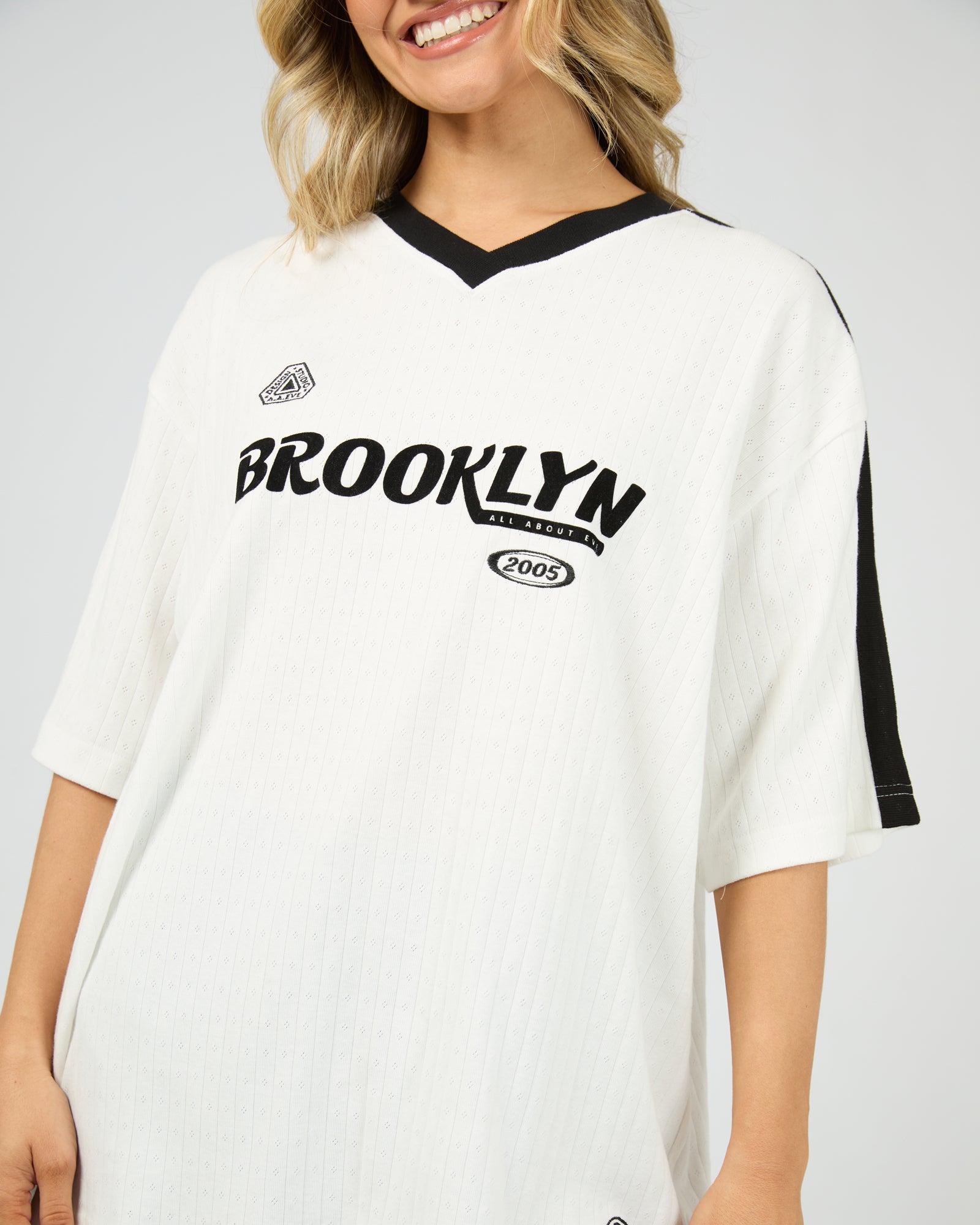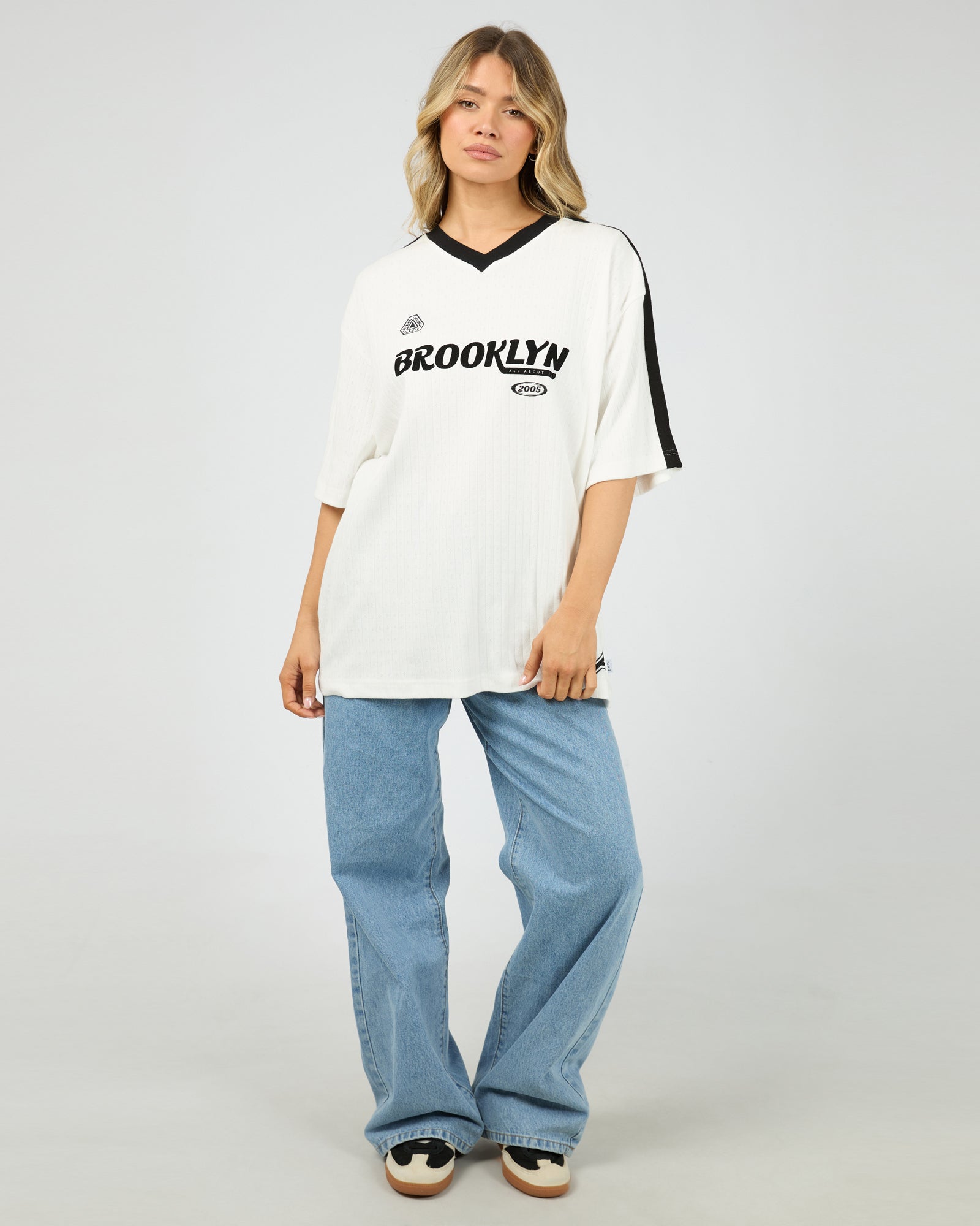 The Kings Oversized Tee in Vintage White is a relaxed, sport-inspired style designed for easy, everyday wear. Cut in an oversized fit, it falls loosely through the body for a laid-back, comfortable feel. Made from cotton with a vintage wash, it feels soft and breathable while offering a gently worn-in look. The ribbed texture adds subtle interest, and the All About Eve exclusive Brooklyn graphic brings a classic, collegiate touch