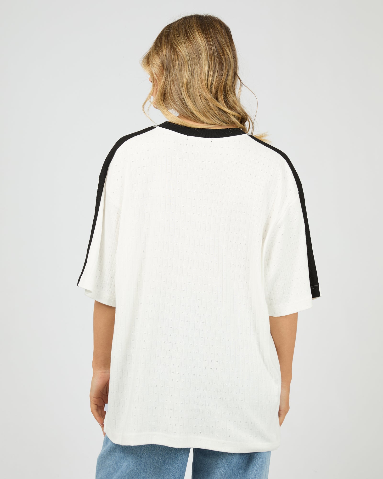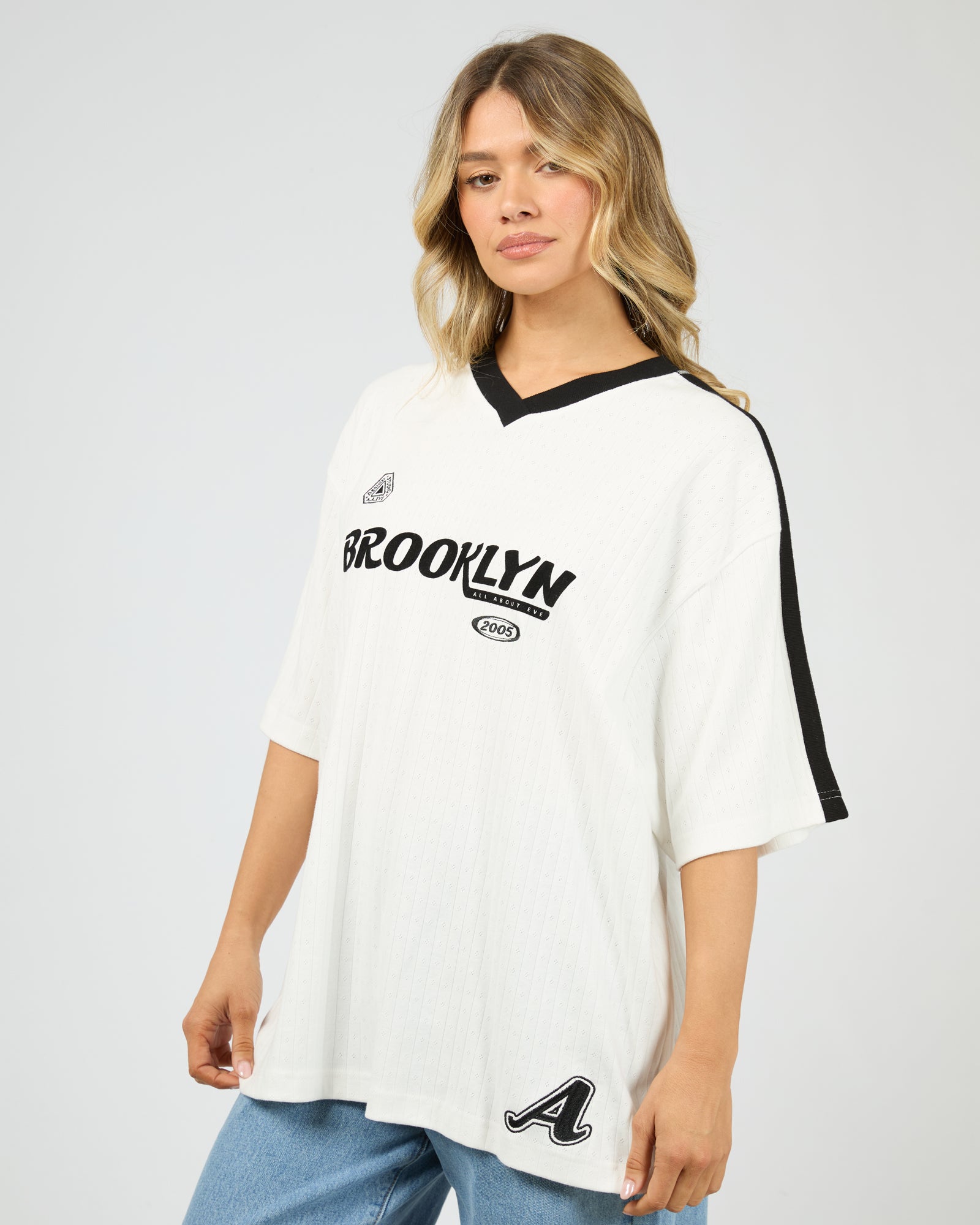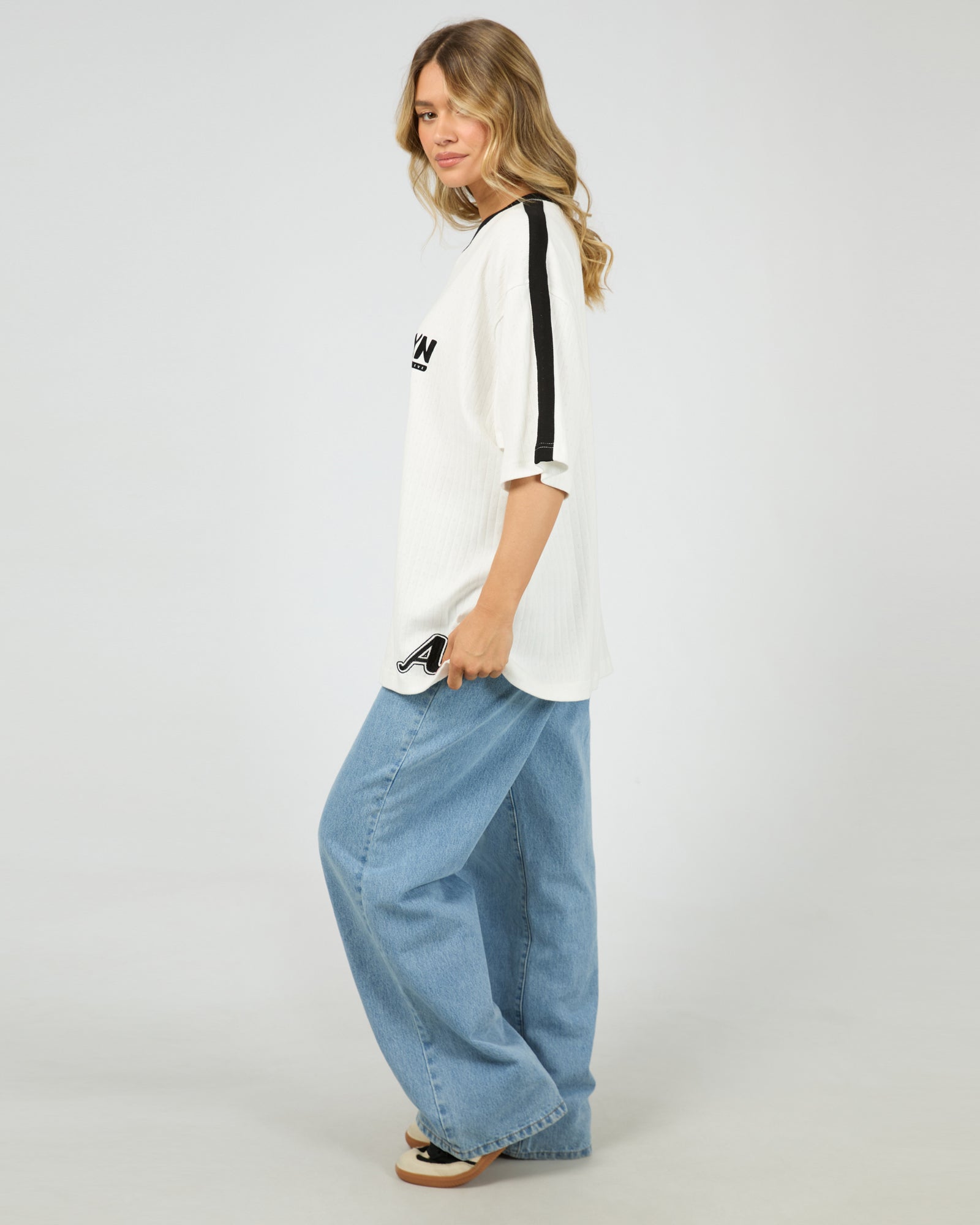 The Kings Oversized Tee in Vintage White is a relaxed, sport-inspired style designed for easy, everyday wear. Cut in an oversized fit, it falls loosely through the body for a laid-back, comfortable feel. Made from cotton with a vintage wash, it feels soft and breathable while offering a gently worn-in look. The ribbed texture adds subtle interest, and the All About Eve exclusive Brooklyn graphic brings a classic, collegiate touch