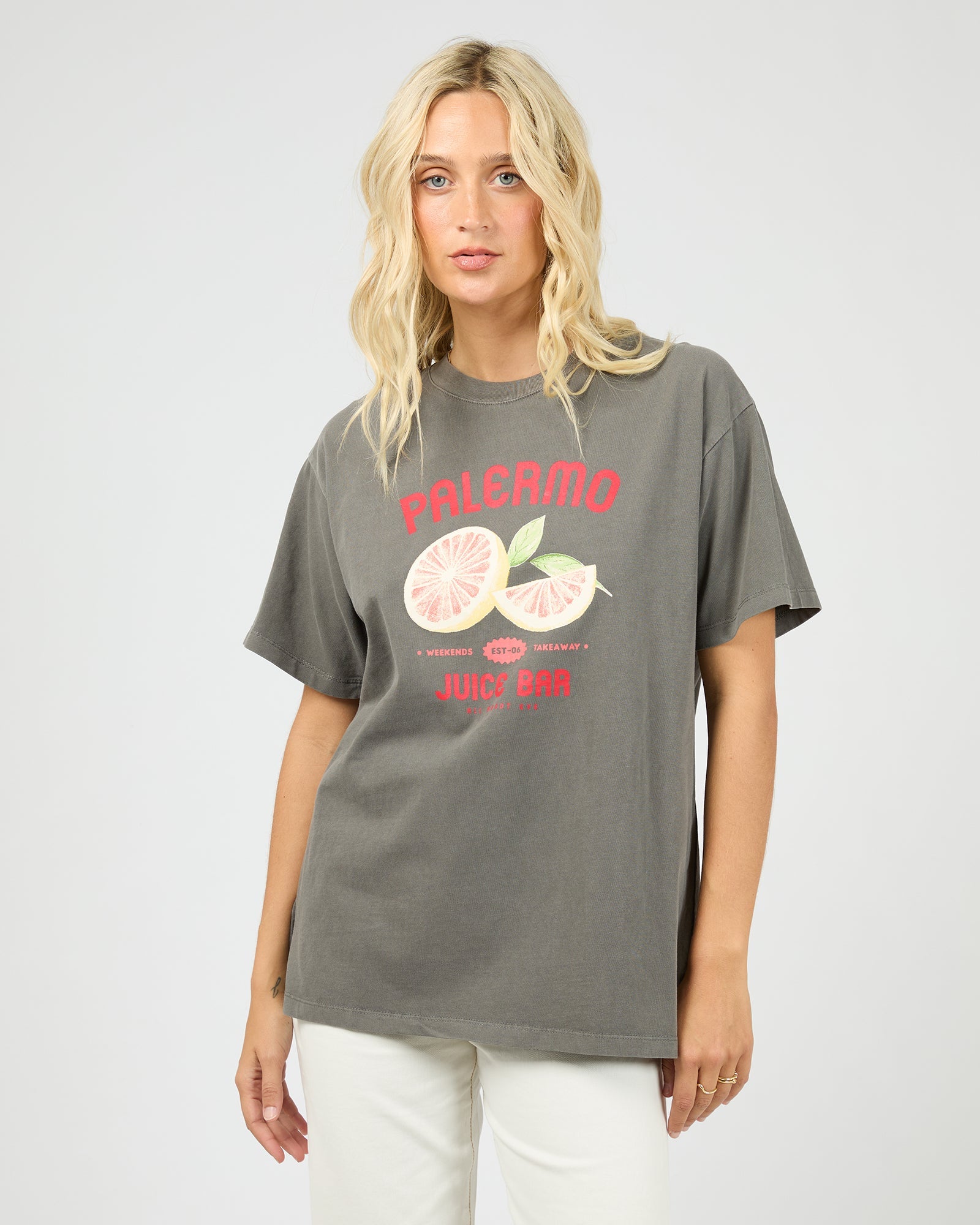 The Palermo Relaxed Tee brings a bold twist to everyday wear with its charcoal base and striking red text, finished with a playful grapefruit graphic for a fresh, zesty vibe. Its relaxed fit and soft cotton fabric make it a go-to for effortless style. Pair with denim or wide-leg pants for an easy, standout look.