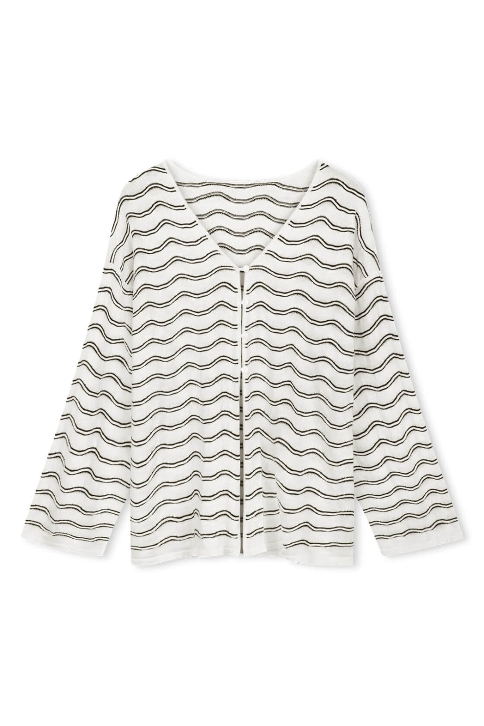 A relaxed button-front top with artisanal texture and coastal ease. The Onda Long Sleeve features wide sleeves, a V-neckline, and a delicate button-and-loop closure. Knitted in Arcaa’s signature wave motif with a breathable linen–cotton blend. Wear it open, closed, or layered with its matching skirt.