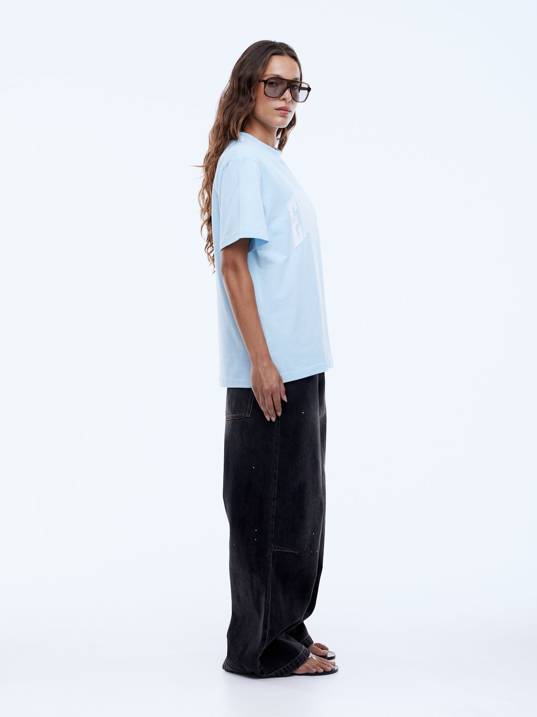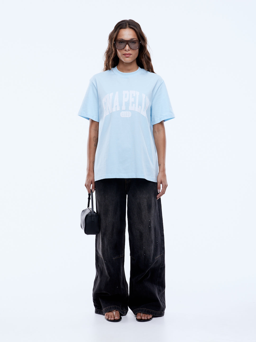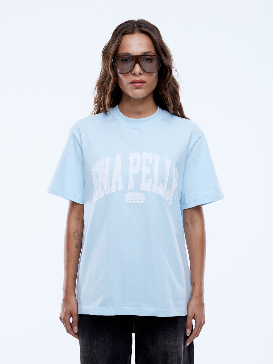 The Collegiate Tee is crafted from a recycled-cotton blend in a relaxed cut with a light blue hue. Finished with contrast collegiate graphics in a crisp plastisol print for a modern athletic mood.