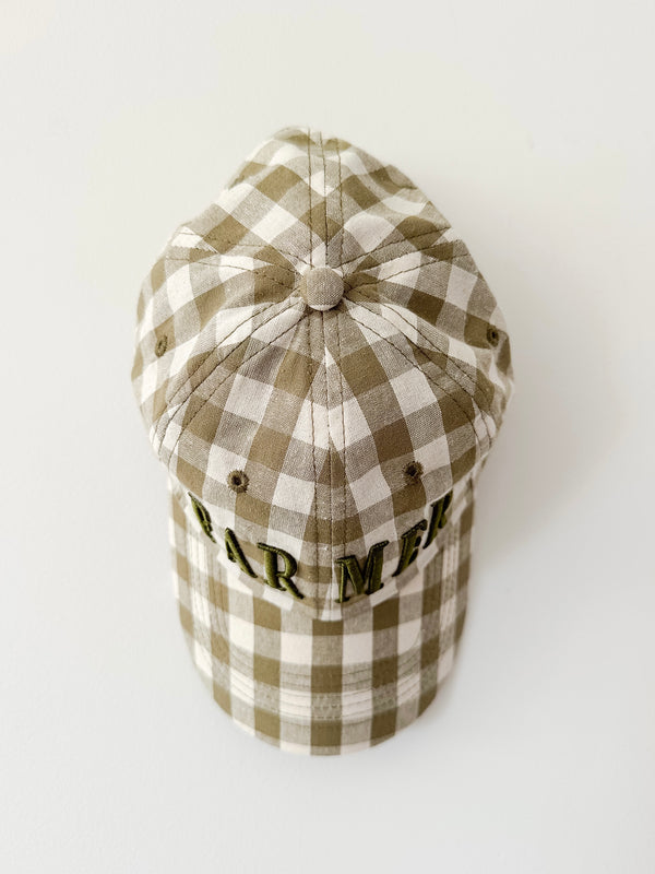 'FAR MER' embroidery on soft check fabric with adjustable metal buckle.