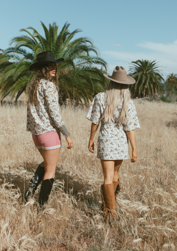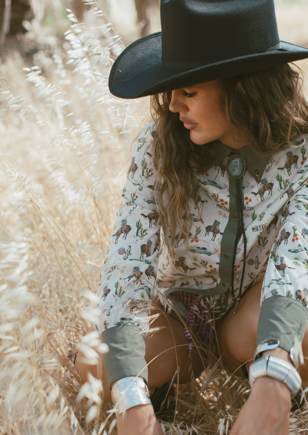 A button-down shirt blooming with desert iconography—each motif lifted from Whitney Spicer’s hand-painted works and printed across soft cotton. The olive green collar and lapel offer earthy contrast, embroidered with quiet detail. Brass-look buttons run down the front, mirrored by detachable brass-look collar points that add a subtle western glint.