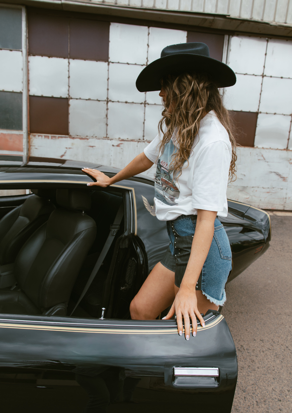 A crisp white canvas for the story of No Man’s Land. This oversized crew tee is cut from premium 230gsm cotton—structured yet soft, with a weight that holds its shape and intention.