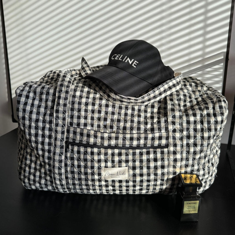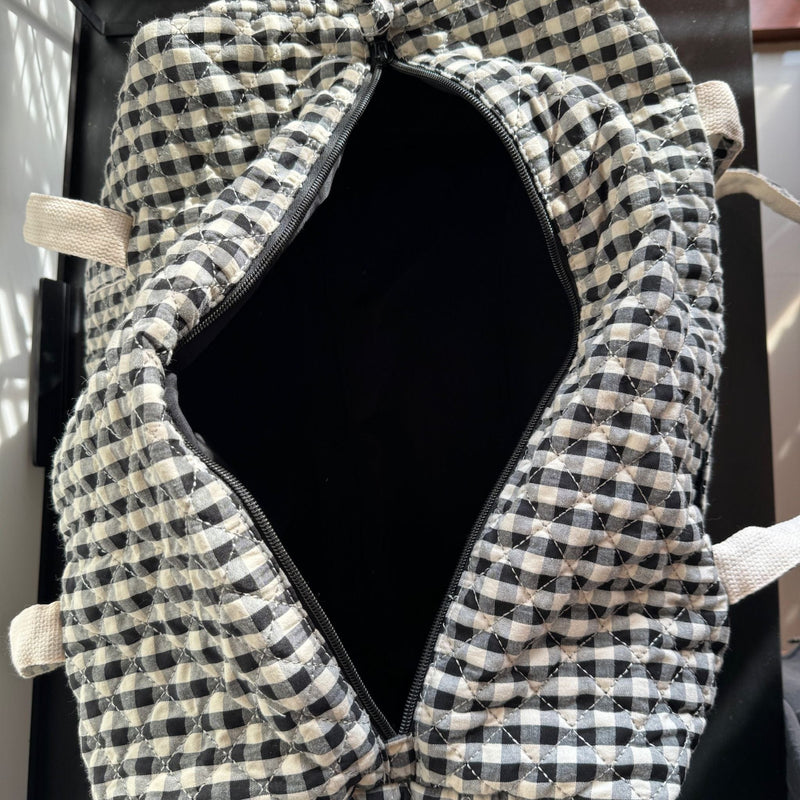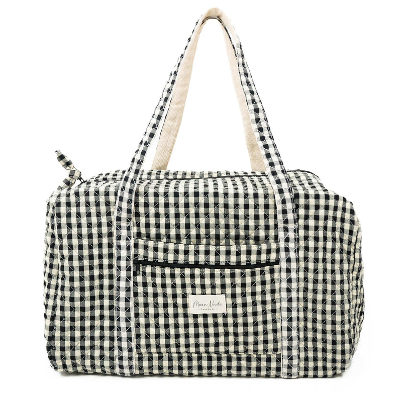 The quilted exterior boasts a beautiful black & white gingham pattern, complemented by the matching minimal black interior.