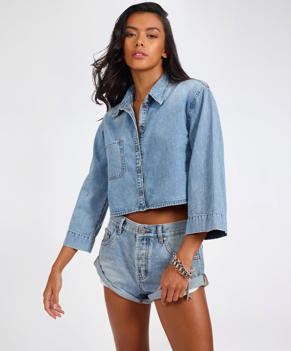 The MISTY BLUE GRACIE CROPPED DENIM SHIRT brings playful proportion with a boxy shape, wide sleeves and soft washed texture.