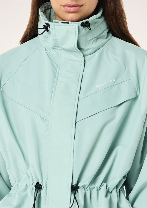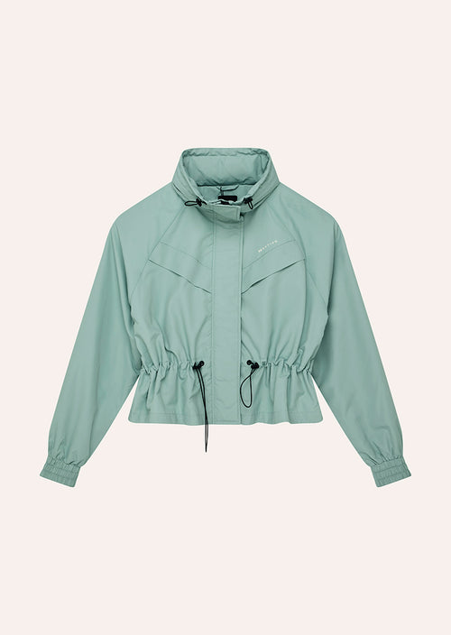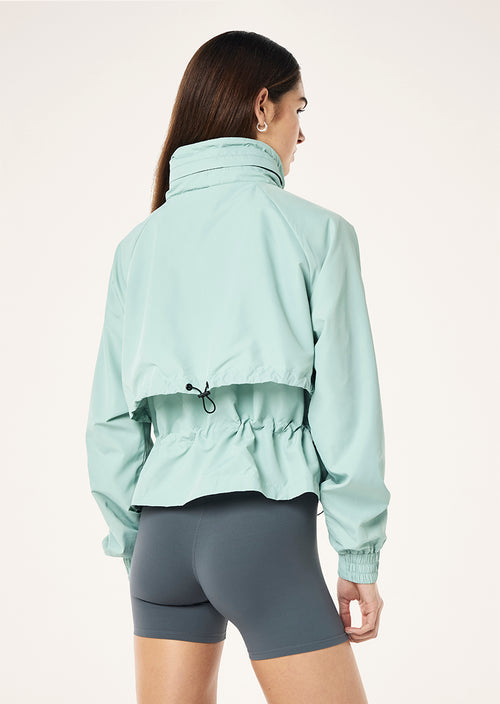 The Shelter Jacket in Dusty Mint is designed in our signature water resistant spray fabric. This cropped jacket features contrast chevron panelling, a hidden chest pocket, an elasticated drawcord waist and a packable hood. Wear your jacket over activewear for an elevated athleisure look.