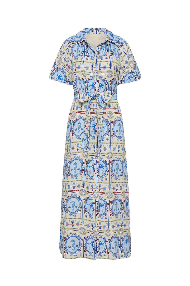 The Carla Dress is crafted from a premium Silk Twill Blend, in our exclusive Lagoona Tile print. Featuring a point collar, voluminous blouson sleeves and an adjustable waist tie to create a relaxed yet elevated look.