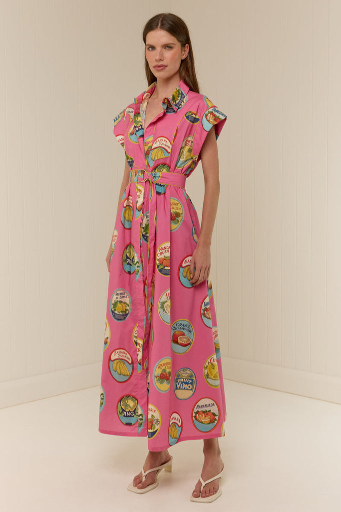 The Siren Dress is crafted from a premium Cotton Poplin in our exclusive La Fruta print. Featuring a structured point collar and adjustable D-ring belt, the Siren Dress offers a crisp silhouette, finished with a western-style yoke and contrast piping for a relaxed yet elevated look.