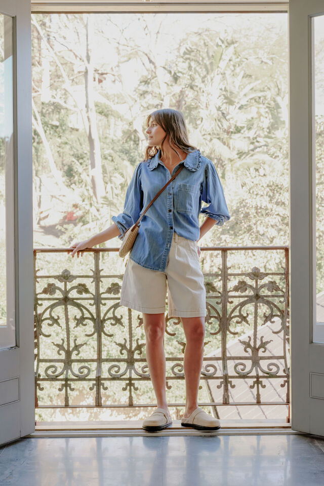 Introducing the Savannah Denim Shirt – effortlessly chic. Crafted from a lightweight blend of organic cotton and linen, this shirt features a soft hand-feel, button-through styling, a rounded collar with frill, and full sleeves gathered into cuffs, it's your ultimate laid-back chic companion!