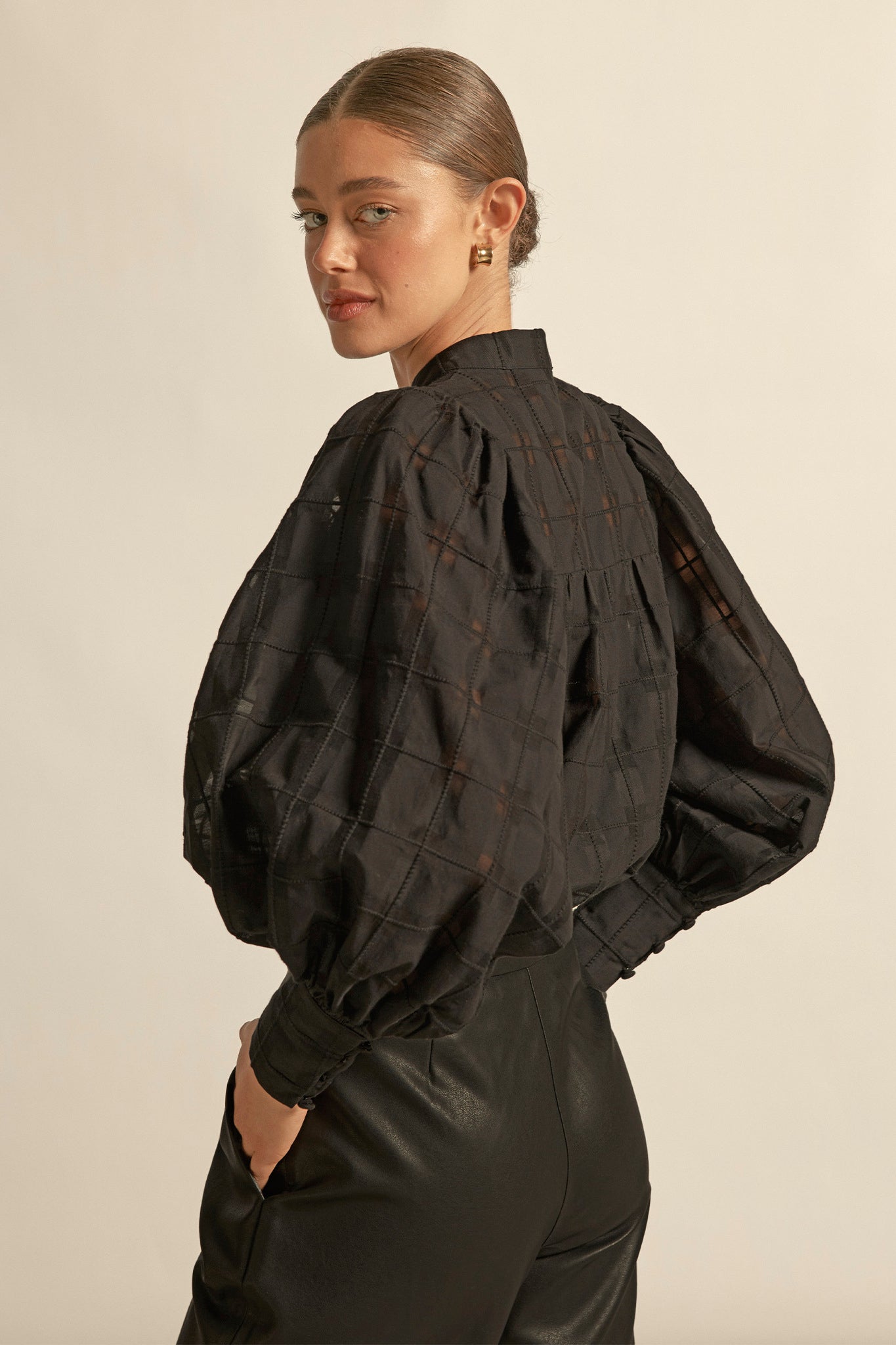 - blouson sleeves finished with a deep cuff for sculptural shape