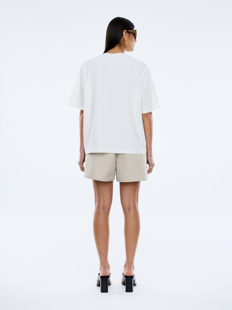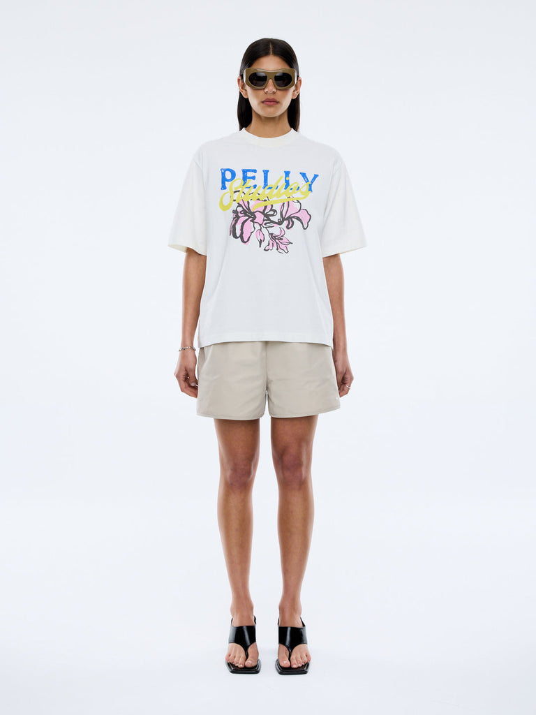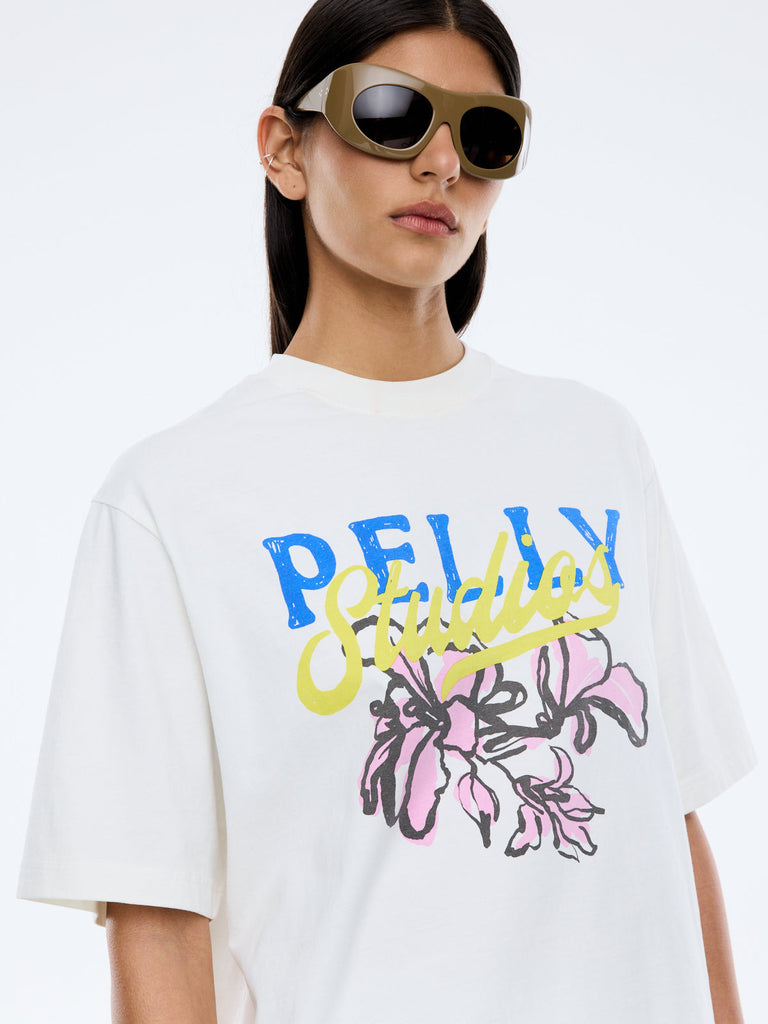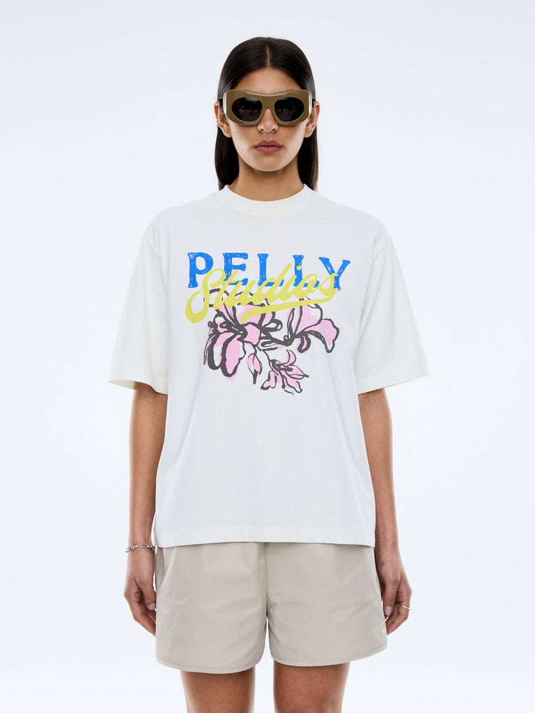 The Pelly Floral Tee in vintage white is crafted from cotton, featuring a boxy relaxed-fit tee silhouette. The tee features a floral inspired graphic exclusively designed inhouse.
