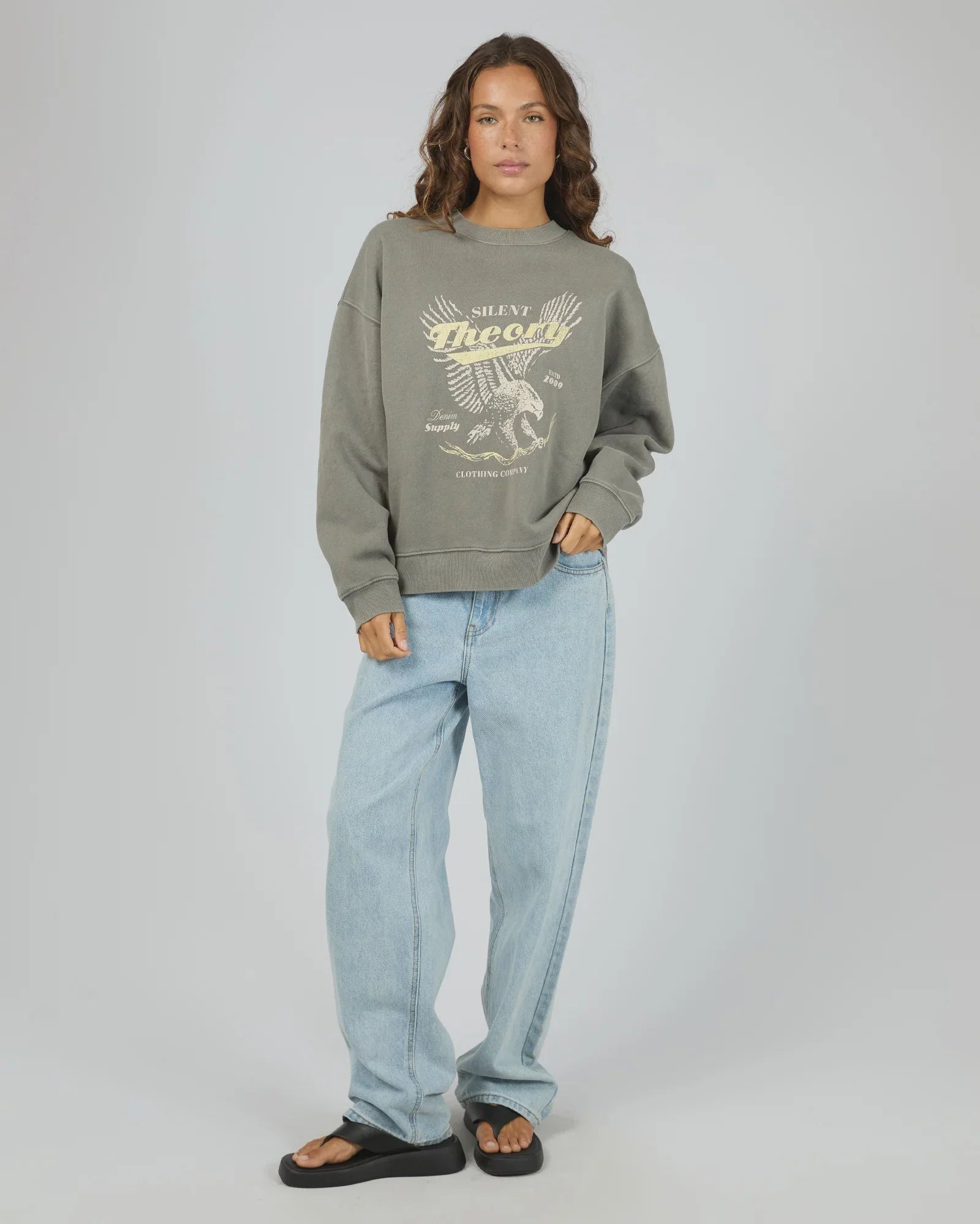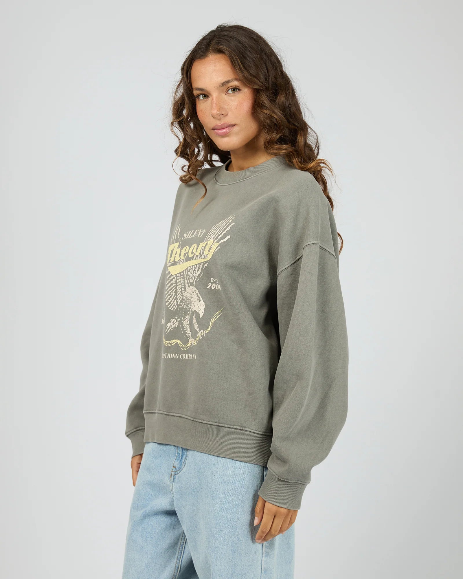 Introducing the Dystopia Crew – your new transeasonal essential. Wrapped in plush brushed fleece, this oversized beauty features a cool washed effect and a striking Americana eagle graphic that demands attention. It's the kind of crew that looks intentional whether you're pairing it with your go-to denim or trackpants for those cosy autumn days when you want to feel comfortable without sacrificing style. Throw it on and instantly nail that effortless vibe.
